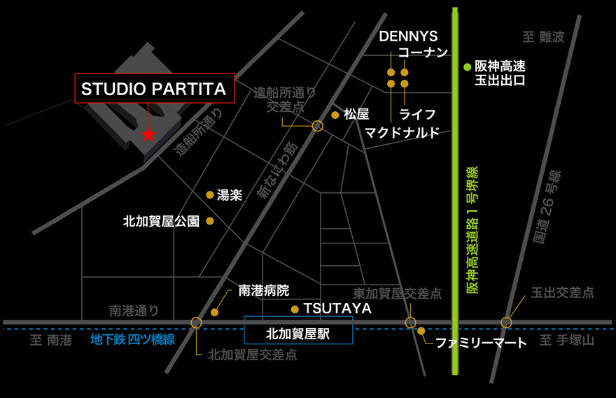 1.高速道路の場合、最寄インターは「阪神高速15号 玉出」。出口を降り、南港通りを西へ曲がります。